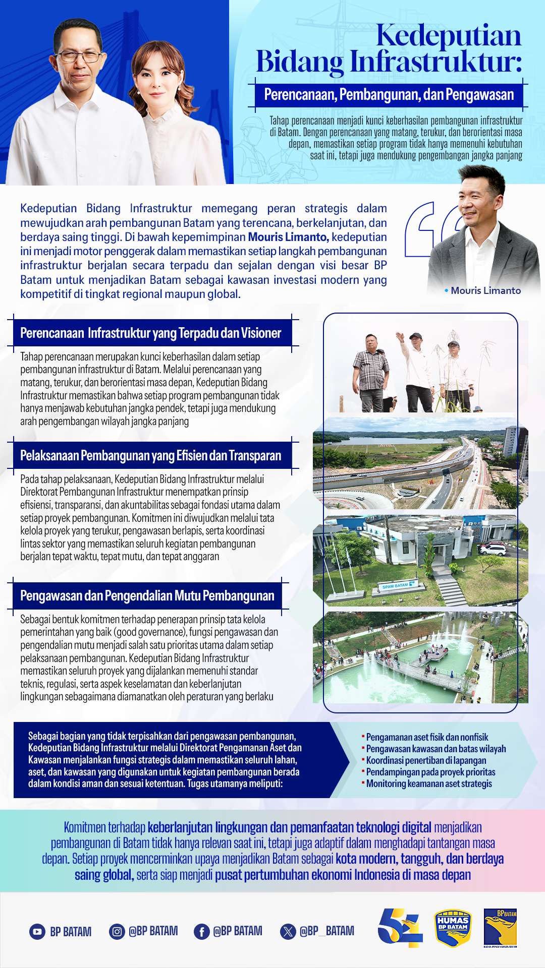 The Deputy for Infrastructure plays a strategic role in realizing the direction of Batam’ s planned, sustainable and highly competitive development. Under the leadership of Mouris Limanto, this deputyship is the driving force in ensuring that every step of infrastructure development is integrated and in line with BP Batam’s big vision to make Batam a modern investment area that is competitive at the regional and global levels.