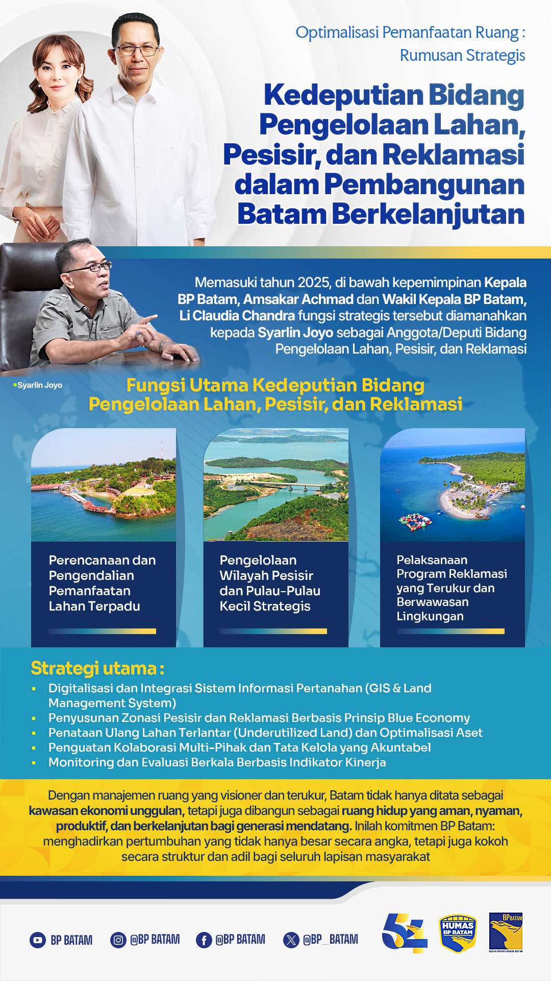 Entering 2025, under the leadership of the Head of BP Batam, Amsakar Achmad and Deputy Head of BP Batam, Li Claudia Chandra, this strategic function is entrusted to Syarlin Joyo as Member/Deputy of Land, Coastal and Reclamation Management. He is entrusted with optimizing spatial planning and control amidst the increasing demand for land for industry, logistics, modern settlements, and large-scale public infrastructure. With a data-driven approach, regulation, and cross-stakeholder collaboration, the Deputy is expected to deliver an orderly, productive, and environmentally friendly Batam spatial planning.