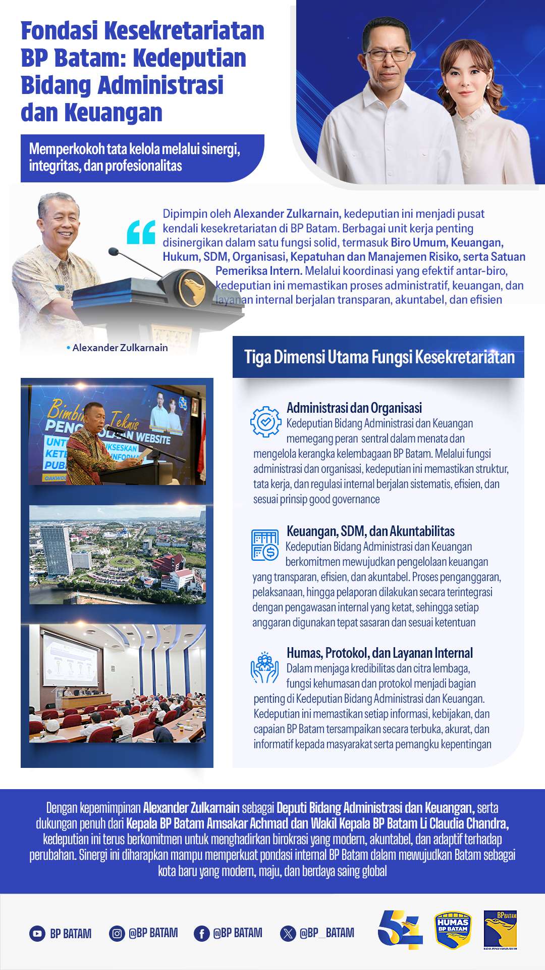 Armed with his experience as Secretary of the Inspectorate General of the Ministry of Finance of the Republic of Indonesia, Alexander Zulkarnain’s firm and visionary leadership and the strategic direction of Amsakar Achmad and Li Claudia Chandra, the Deputy for Administration and Finance is committed to maintaining the organization’s operational continuity, strengthening the secretarial system, and ensuring that every step of BP Batam’s policy is in line with the Agency’s big vision , making Batam a modern, advanced and globally competitive city.