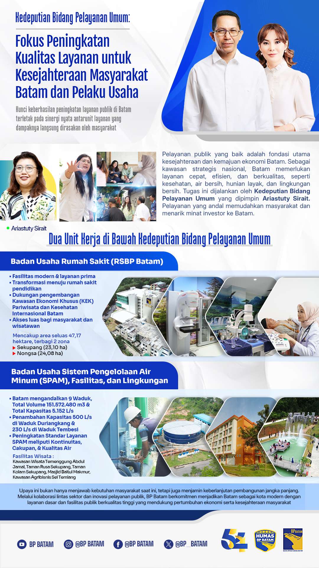 Peningkatan kualitas layanan oleh Kedeputian Bidang Pelayanan Umum merupakan sebuah investasi sosial ekonomi jangka panjang yang berdampak langsung pada peningkatan taraf hidup masyarakat dan kemudahan berusaha di Batam. Layanan publik yang kuat menciptakan lingkungan sosial yang stabil, mendukung produktivitas masyarakat, dan memperkuat daya tarik Batam sebagai pusat pertumbuhan ekonomi strategis nasional. Melalui pengelolaan layanan kesehatan, air bersih, fasilitas hunian, fasilitas publik, kawasan wisata, serta pengelolaan lingkungan yang terintegrasi, BP Batam membangun fondasi kota yang tangguh, inklusif, dan siap bersaing secara global.