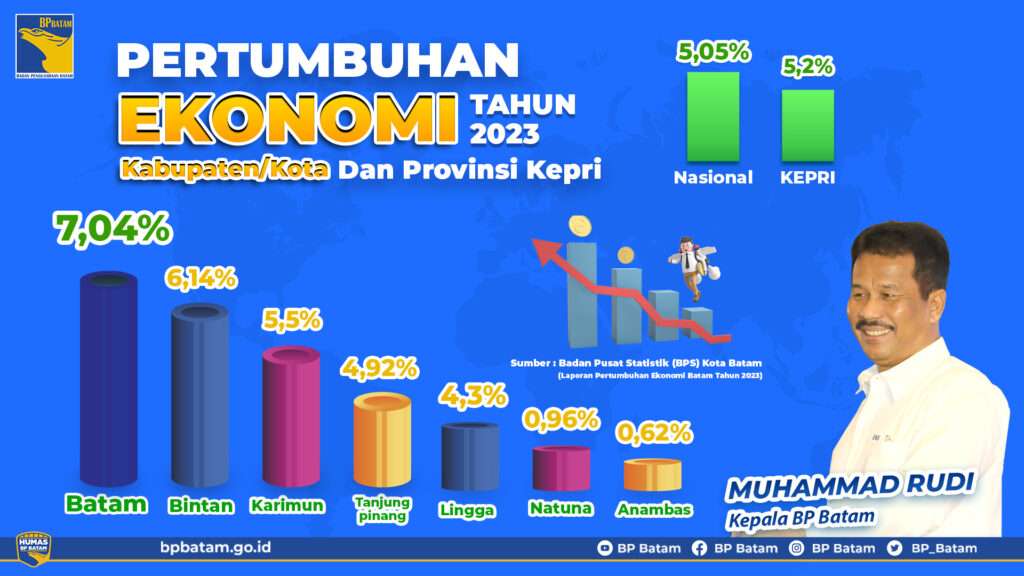 Kepala BP Batam, Muhammad Rudi mengaku bersyukur atas pertumbuhan ekonomi Batam meningkat tajam hingga 7,04 persen sepanjang tahun 2023. Angka itu lebih tinggi dibandingkan pertumbuhan ekonomi Kepulauan Riau sebesar 5,20 persen dan nasional 5,05 persen.
