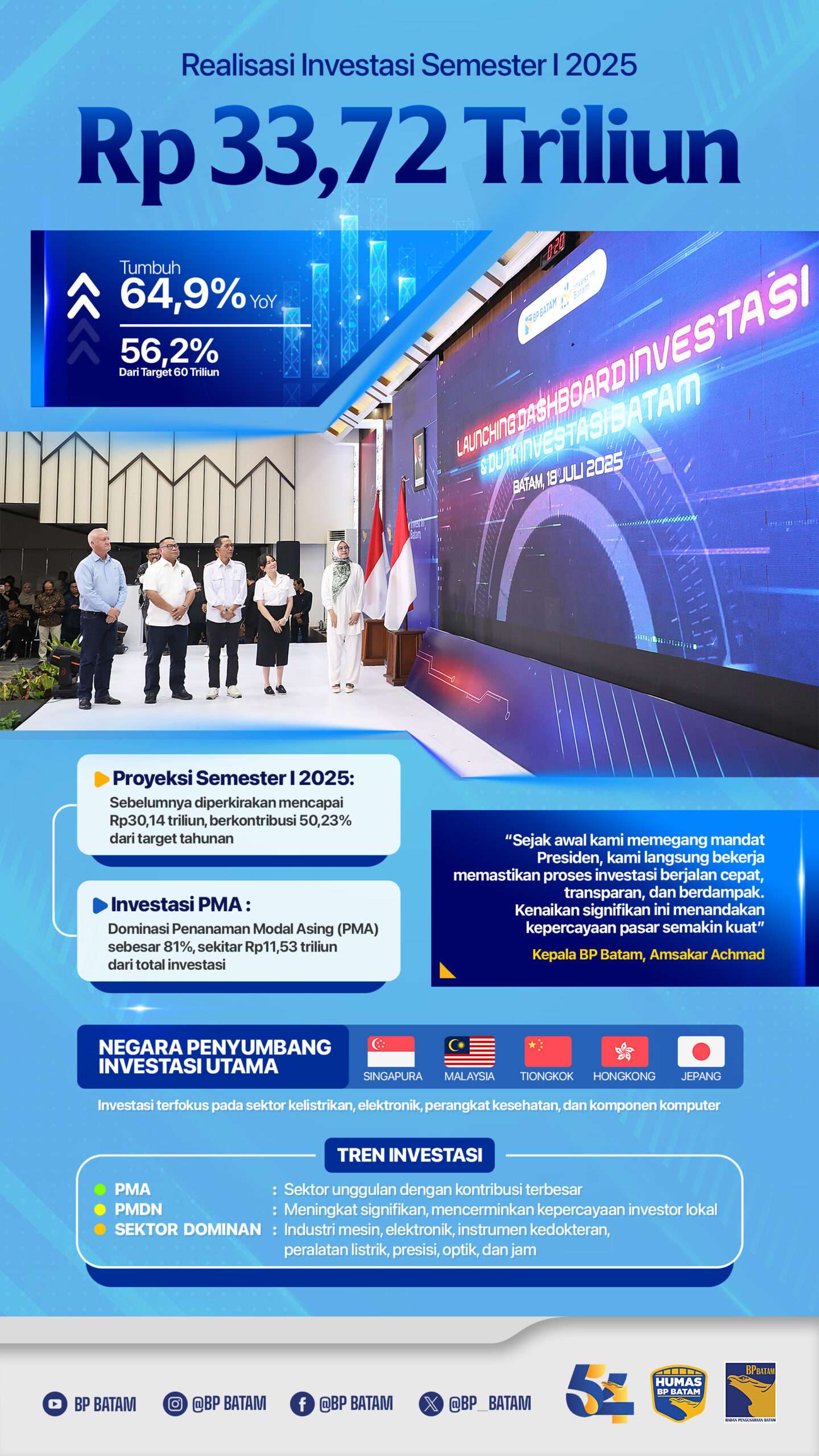 Dengan strategi tersebut, Semester II 2025 diharapkan menjadi momentum penting bagi Batam untuk memperkuat posisinya sebagai kawasan investasi berdaya saing global sekaligus lokomotif pertumbuhan ekonomi Indonesia.