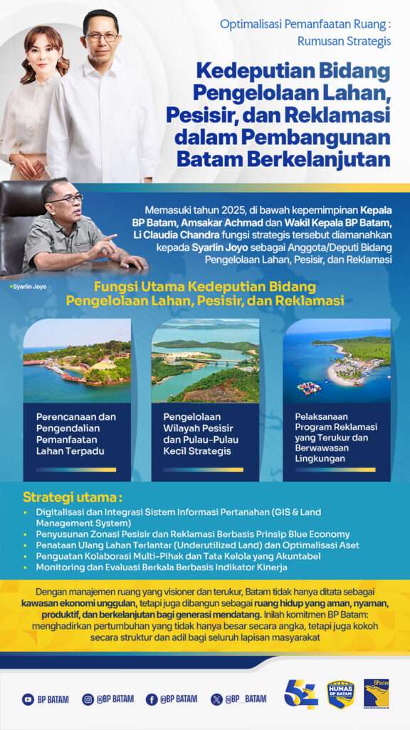 Memasuki tahun 2025, di bawah kepemimpinan Kepala BP Batam, Amsakar Achmad dan Wakil Kepala BP Batam, Li Claudia Chandra fungsi strategis tersebut diamanahkan kepada Syarlin Joyo sebagai Anggota/Deputi Bidang Pengelolaan Lahan, Pesisir, dan Reklamasi. Ia dipercaya untuk mengoptimalkan perencanaan dan pengendalian ruang di tengah meningkatnya kebutuhan lahan untuk industri, logistik, permukiman modern, dan infrastruktur publik berskala besar. Dengan pendekatan berbasis data, regulasi, dan kolaborasi lintas pemangku kepentingan, Kedeputian ini diharapkan mampu menghadirkan tata ruang Batam yang tertib, produktif, dan ramah lingkungan.